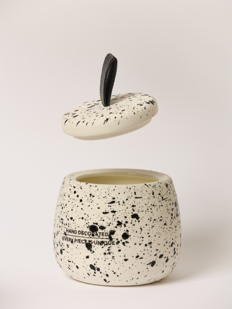 Οι διακριτικές πιτσιλιές του δίνουν μια καλλιτεχνική διάσταση, σαν ένα μικρό αντικείμενο design που τραβά το βλέμμα χωρίς να το απαιτεί. Η απλή του φόρμα αφήνει χώρο για τις λεπτομέρειες να ξεχωρίσουν.